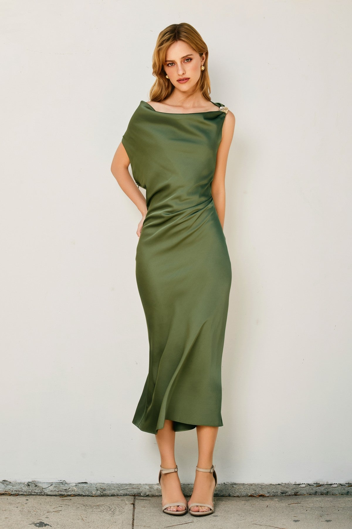 This dull satin ruched midi dress is the perfect piece for weddings, graduations, anniversaries, or just a random day you want to feel extra beautiful! Comes in three different colors: green, black, and brown.